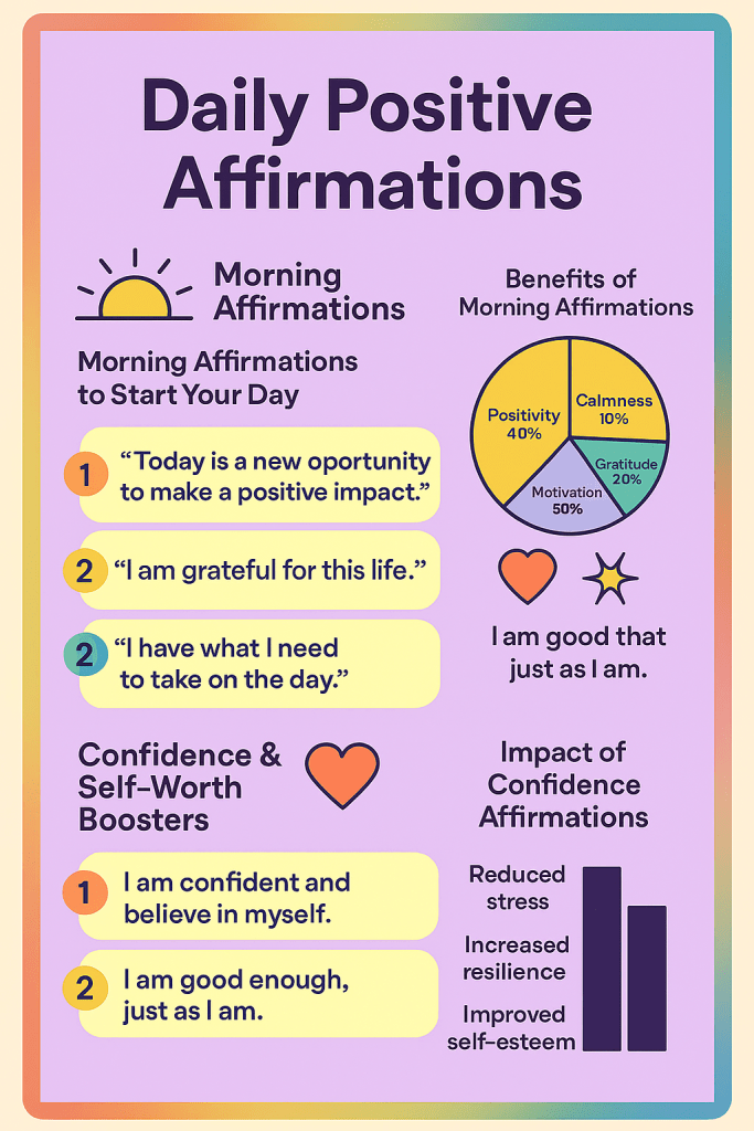 The following infographic details a few examples of positive daily affirmations and their benefits. All graphs, charts and infographics are generated with Copilot AI Companion for your viewing enjoyment and easy learning. Enjoy!