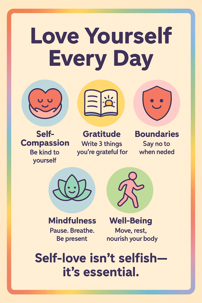 | Self-Love | Holistic care & respect | Compassion & boundaries | “I deserve rest and kindness.” |